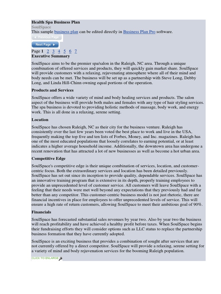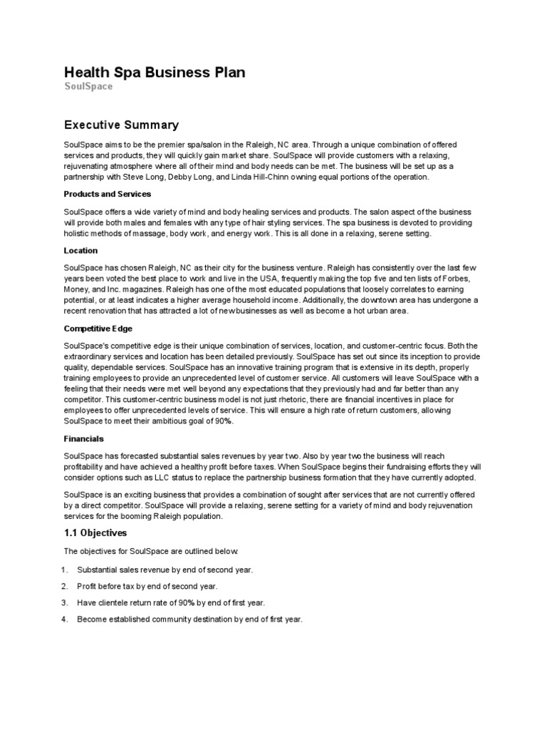 Health Spa Business Plan Health Spa Business Plan / Did you tap into your entrepreneurial spirit and see an opportunity for a lifestyle change?